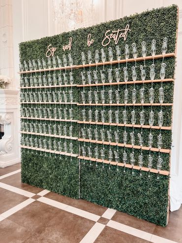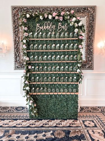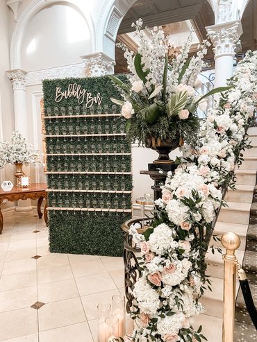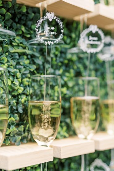 Image is of a green champagne wall with 6 rows of champagne glasses hanging on it with balloons arou