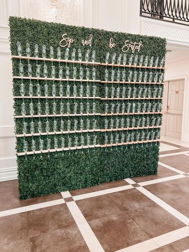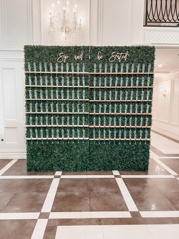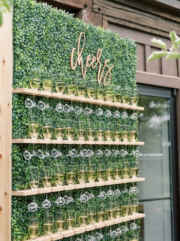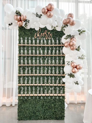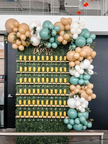 Image is of a green champagne wall with the word cheers in the center and balloons around it.