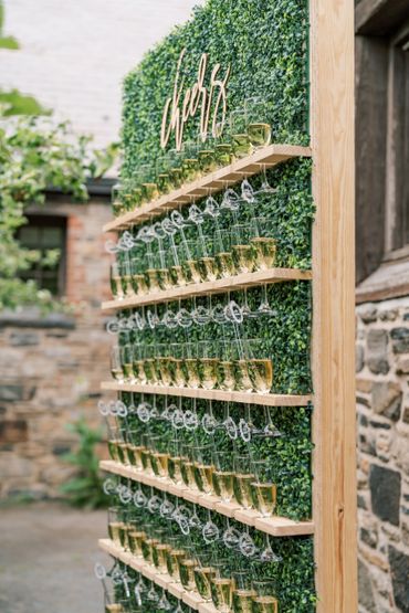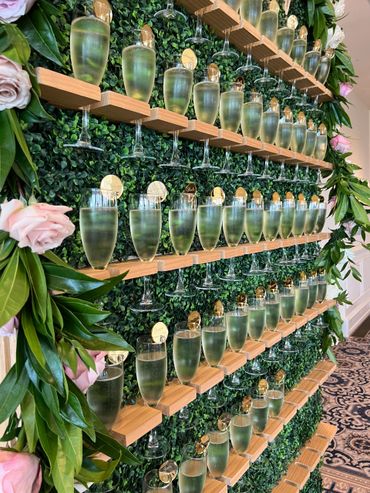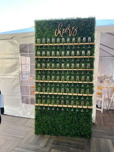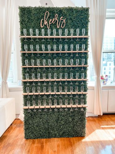 Image is of a green champagne wall with 6 rows of champagne glasses hanging on it.